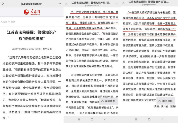 此类以维权之名行牟利之实的行为,早已成为多地法院重点规制对象。2024年5月媒体官方报道的文章《江苏省法院提醒:警惕知识产权“碰瓷式维权”》明确指出,部分市场主体批量购买图片版权后不用于经营,而是通过批量诉讼牟利,这种商业化维权模式已偏离知识产权保护初衷。