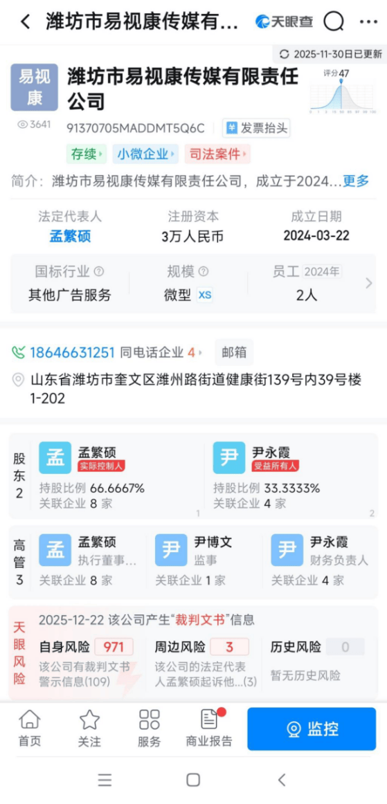天眼查信息显示,潍坊市易视康传媒成立于2024年3月22日,注册资本仅3万元,法定代表人为孟繁硕,股东为孟繁硕与尹永霞,监事为尹博文。