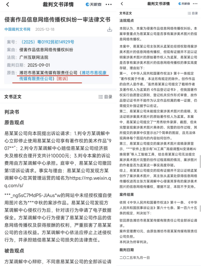 耿先生的遭遇是该公司维权模式的典型缩影。法院出具的数字内容存证显示,潍坊易视康传媒于2025年1月6日对耿先生公众号的元旦活动记录文章进行取证,涉事图片仅为非盈利性配图。