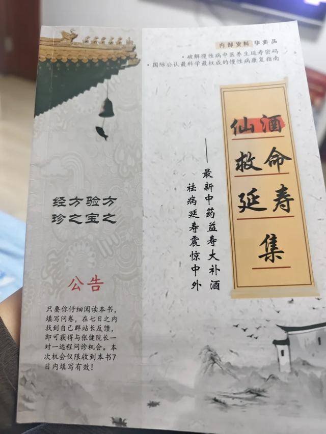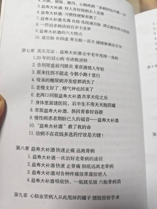 说是说明书,王女士一看书名《仙酒救命延寿集》,差点气晕过去。再看书里的内容,有一章叫“真实见证:XX大补酒让中老年甩掉一身病”,其中不乏“20年的冠心病奇迹般逆转”“原来拄拐不能走,今朝小跑十里行”“XX大补酒救了我的命”等离谱案例。