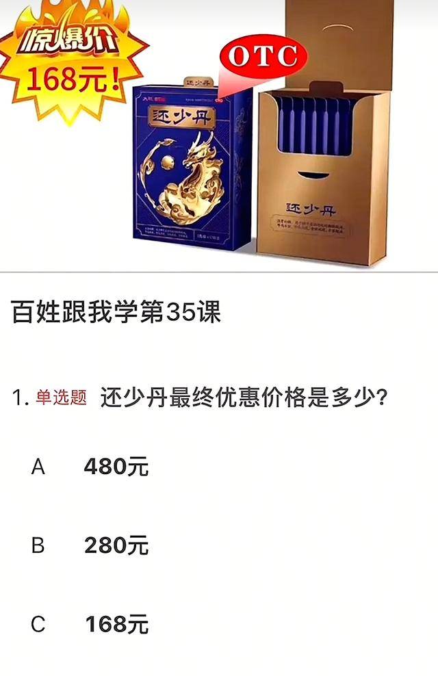 有些养生课,系统还会随课给出一道选择题让老人来答,这些题的出题节奏也和带货节奏完全同步。在铺垫阶段,只是普通的养生知识题,比如某样药材有什么作用等等,而到了带货阶段,甚至会出现“某产品最终优惠价是多少”这种题目。