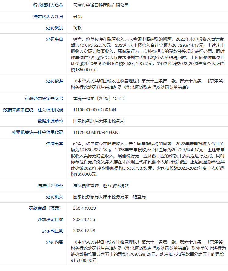 口腔医疗行业的税收合规底线不容触碰,天津市中诺口腔医院有限公司却因隐匿收入、未依法代扣个税等多重税收违法行为,迎来重磅罚单。2025年12月26日,国家税务总局天津市税务局第一稽查局公布行政处罚决定(津税一稽罚〔2025〕158号),该医院因偷税及未按规定代扣代缴个人所得税,被依法处以268.439929万元罚款,处罚信息公示将持续至2028年12月26日,高额罚单直击医疗行业税收违法的痛点。