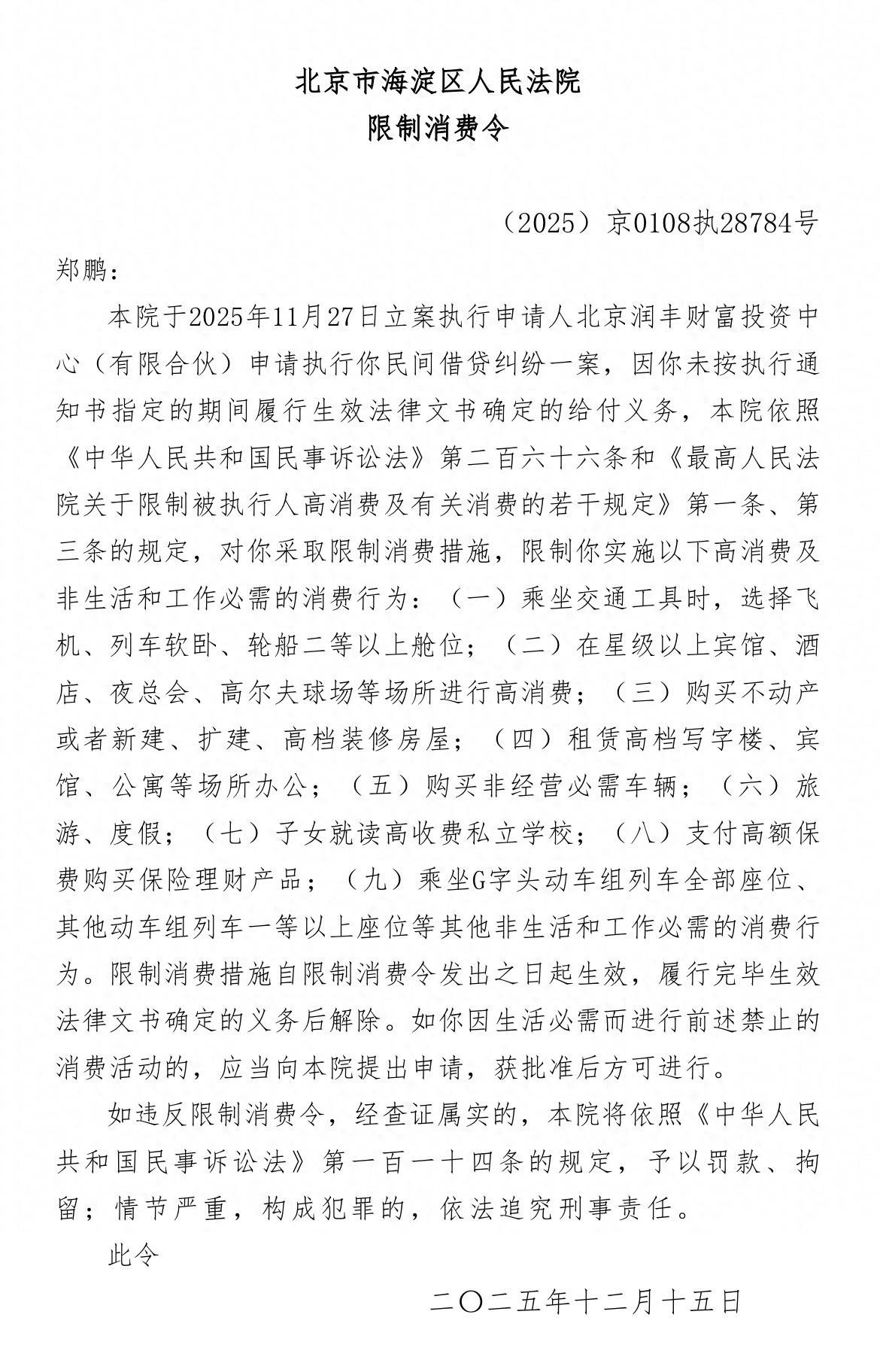 公开信息显示,2025年11月27日,北京市海淀区人民法院已正式立案执行申请人北京润丰财富投资中心(有限合伙)申请执行郑鹏民间借贷纠纷一案。根据限制消费令内容,郑鹏被明确限制实施九类消费行为,具体包括:乘坐交通工具时选择飞机、列车软卧、轮船二等以上舱位及G字头动车组列车全部座位、其他动车组列车一等以上座位;在星级以上宾馆、酒店、夜总会、高尔夫球场等场所进行高消费;购买不动产、新建、扩建或高档装修房屋;租赁高档写字楼、宾馆、公寓等场所办公;购买非经营必需车辆;旅游、度假;让子女就读高收费私立学校;支付高额保费购买保险理财产品,以及其他非生活和工作必需的消费行为。