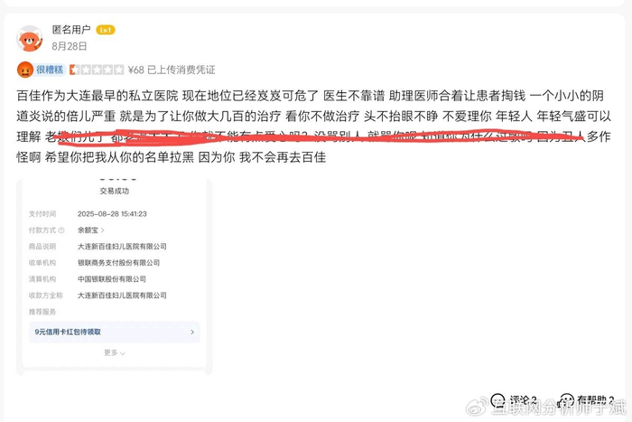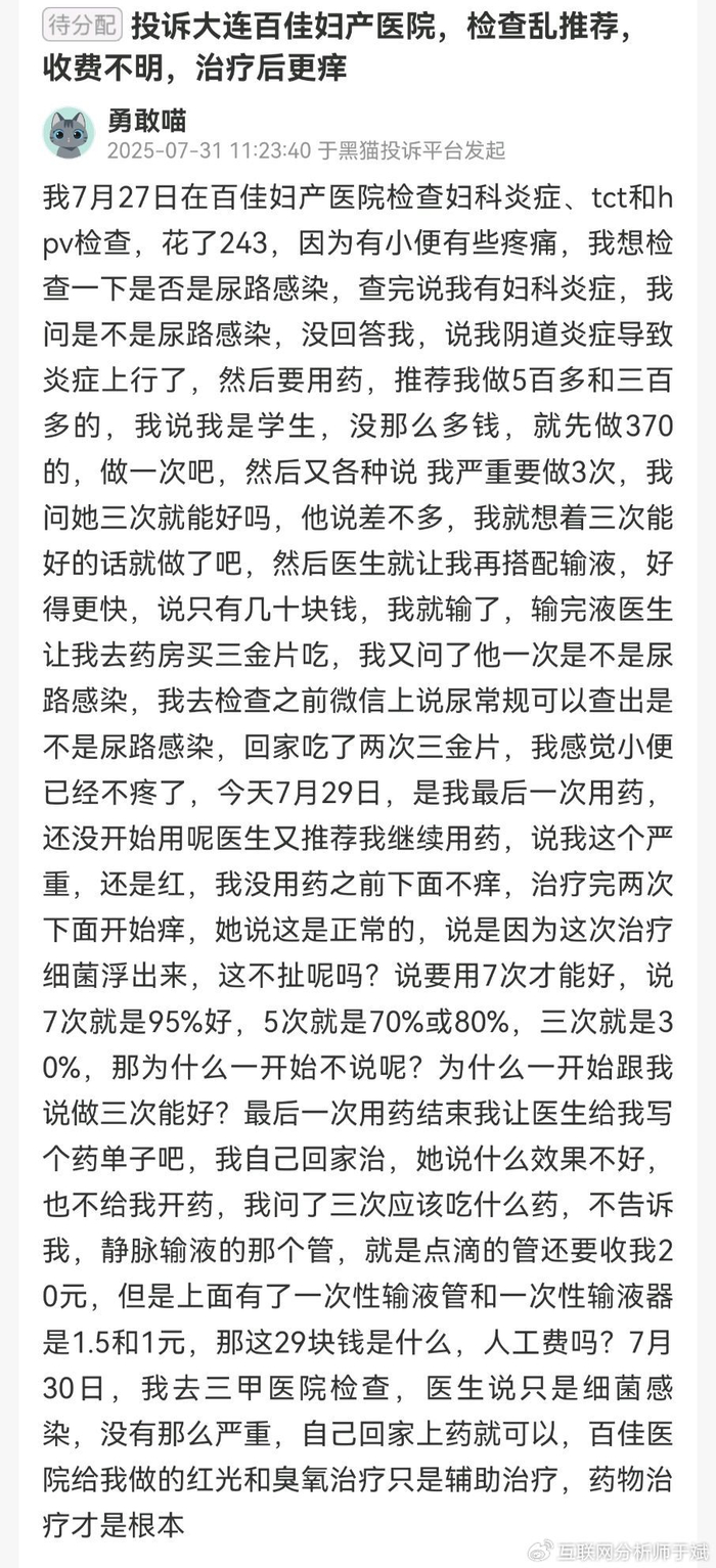 7月31日,有患者在黑猫投诉平台发起投诉称大连百佳妇产医院检查乱推荐、收费不明、治疗后更痒。