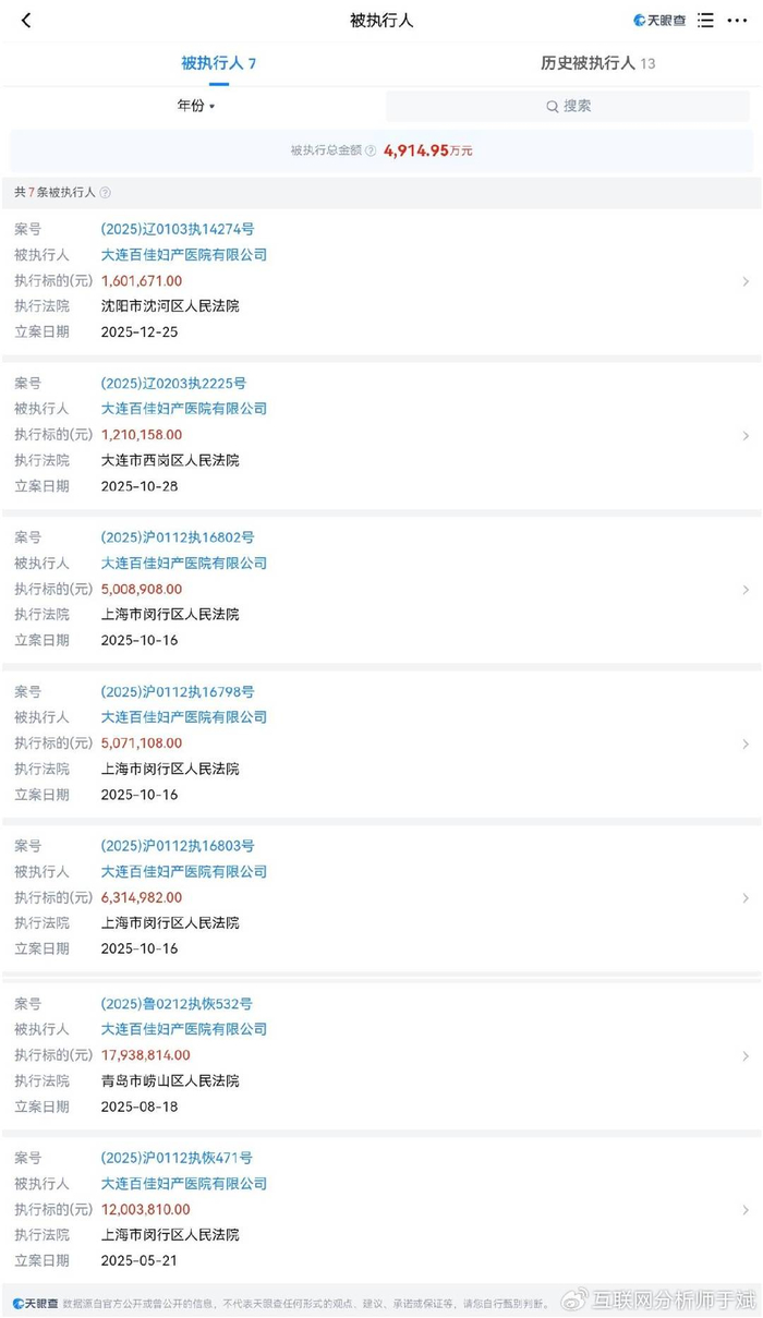 根据天眼查显示,自2025年5月起,大连百佳妇产医院被全国 4 地法院 7 次立案强制执行,历史被执行人记录共13条,涉及被执行的总金额共4914.95万元。这说明大连百佳妇产医院的资金链已严重断裂,正被多家债权人“围追堵截”。