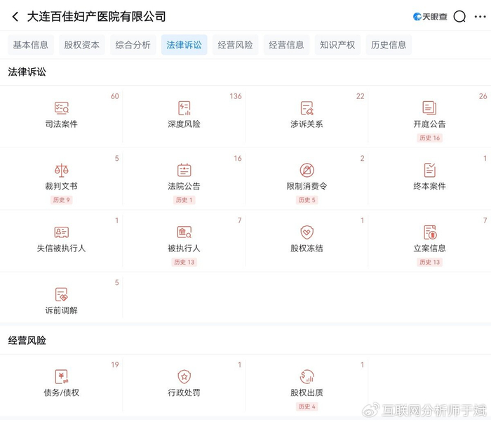 据天眼查显示,大连百佳妇产医院涉及大量经营风险。综合来看,该机构近年来涉诉频繁、偿债能力不足,已被多次列入失信及被执行名单,同时存在股权被冻结、出质以及行政处罚等多重风险,商业信誉和资金状况引发一系列连锁反应。