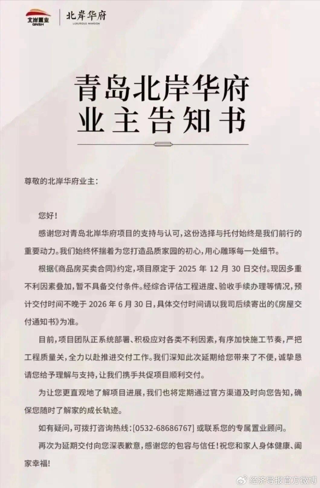 2025年末,青岛城阳区属国企——青岛北岸控股集团的运营困局持续发酵:旗下北岸华府项目以“多重不利因素叠加”为由延期半年交付。据悉,该项目原定于2025年12月30日交付,由于暂不具备交付条件,项目方拟延期交付,预计交付时间不晚于2026年6月30日。而这,只是该集团遭遇困境的冰山一角。