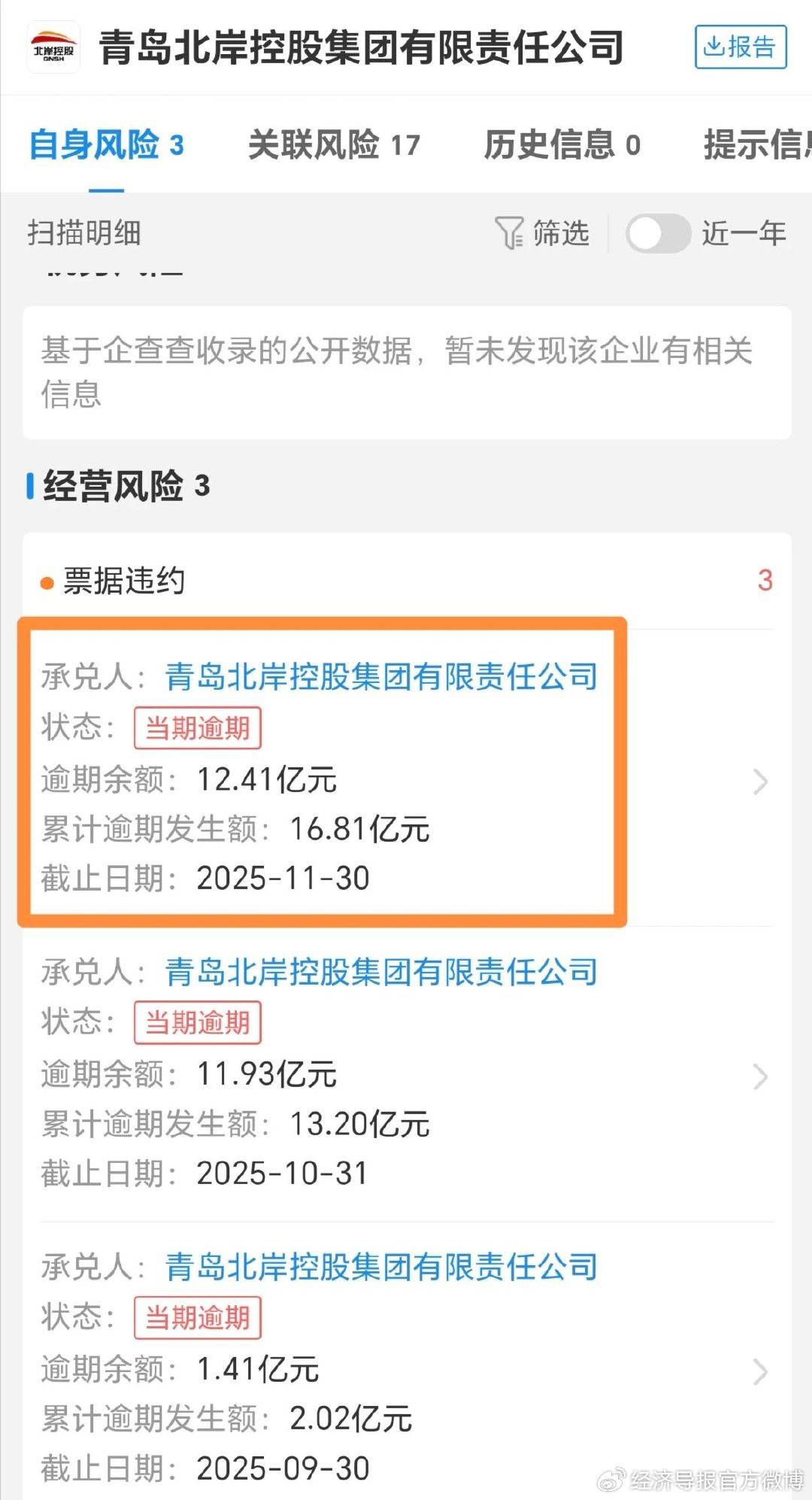 企查查提供的信息和数据显示,青岛北岸控股集团存在“票据持续逾期”等状况。该集团商票逾期余额从9月底的1.41亿元飙升至10月底的11.93亿元,11月新增逾期再添隐忧——截至11月30日,该集团商票逾期余额达12.41亿元,面临的流动性风险不容小觑。