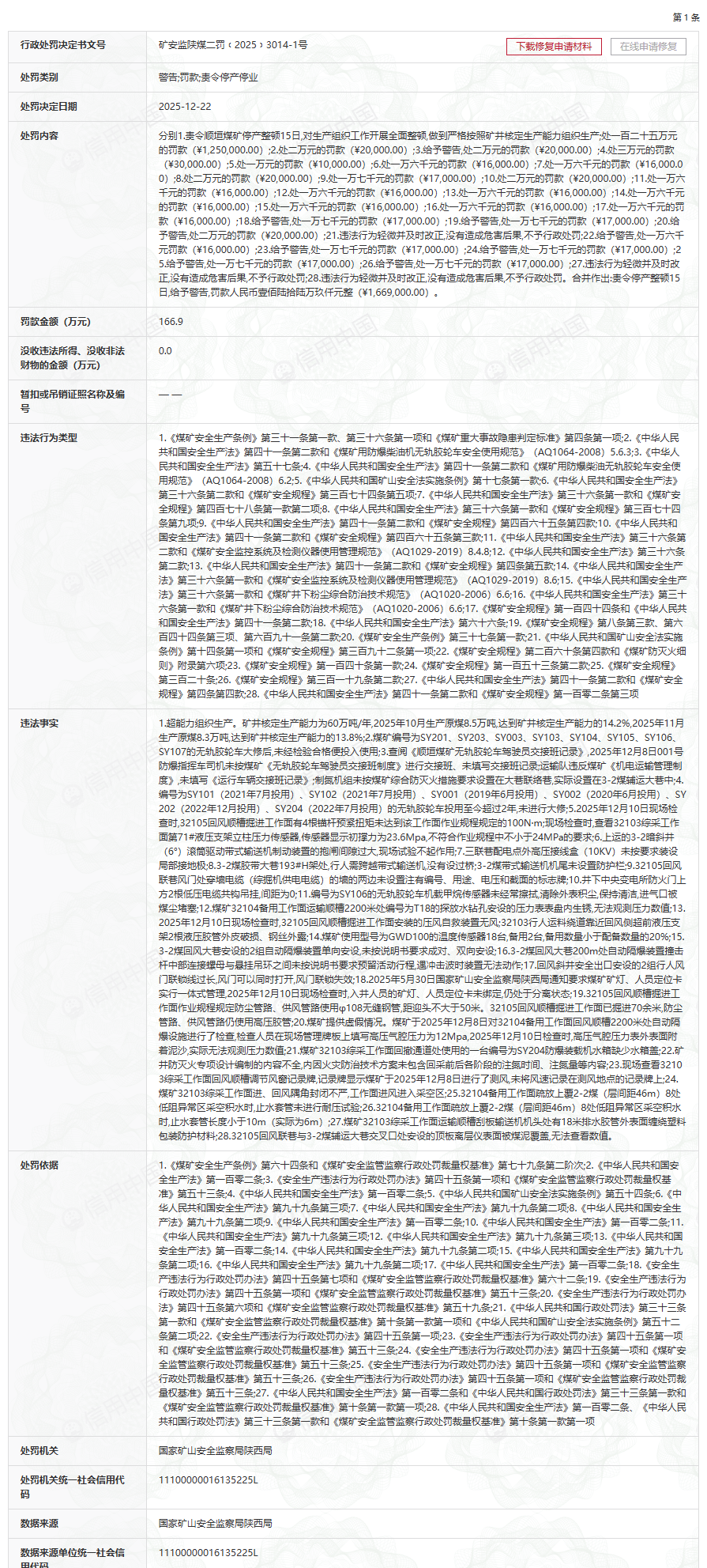 2025年12月,信用中国(陕西)平台公示矿安监陕煤二罚〔2025〕3014-1号行政处罚决定,府谷县顺垣煤矿(普通合伙)因超能力生产、多项安全生产违规,被国家矿山安全监察局陕西局处以166.9万元罚款,并责令停产整顿15日,严厉处罚彰显陕西煤矿安全监管的刚性力度。