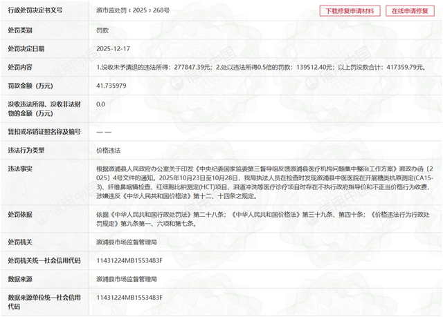 在收费环节,溆浦县市场监管局12月17日出具的溆市监处罚〔2025〕268号罚单指出,该院在糖类抗原测定、红细胞比积测定等医疗诊疗项目中,存在不执行政府指导价和不正当价格行为收费的问题,被没收未清退违法所得277847.39元,并处违法所得0.5倍罚款139512.40元,罚没合计超41万元。医疗服务价格关乎患者就医成本,随意调价、违规收费的行为让群众就医负担无端增加。