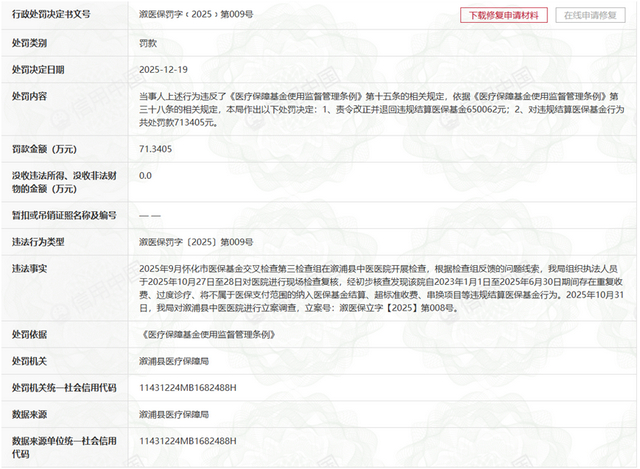 其中,溆浦县医保局于12月19日下达的溆医保罚字〔2025〕第009号处罚决定显示,经核查,该院2023年1月至2025年6月期间存在重复收费、过度诊疗、将非医保支付范围项目纳入医保结算、超标准收费等行为,违规结算医保基金650062元,最终被责令退回该笔资金,并处罚款713405元。医保基金是百姓的“看病钱”“救命钱”,该院的违规行为直接损害了参保人的切身利益。