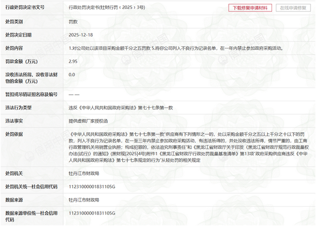 2025年12月18日,牡丹江市财政局作出《行政处罚决定书(牡财行罚﹝2025﹞3号)》,针对该公司的违法失信行为作出明确处罚:一是对公司处以该项目采购金额千分之五的罚款,罚款金额达2.95万元;二是将其列入不良行为记录名单,且在一年内禁止参加政府采购活动。此次处罚依据《中华人民共和国政府采购法》第七十七条第一款及《黑龙江省财政厅关于印发〈黑龙江省财政厅规范行政裁量权办法(试行)〉的通知》等相关规定作出,充分体现了财政监管部门对政府采购领域违法失信行为“零容忍”的监管态度。