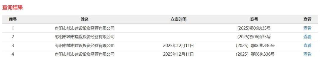 值得注意的是,枣阳城投深陷法律纠纷。据中国执行信息公开网及枣阳城投公司公告,截至2025年12月31日,枣阳城投近一年有2条被执行人记录。其中,金额最高的一笔执行案是在2025年12月11日(立案日期),因借款合同纠纷,湖北省襄阳市中级人民法院将枣阳城投纳入被执行人名单,执行标的5038.36万元。