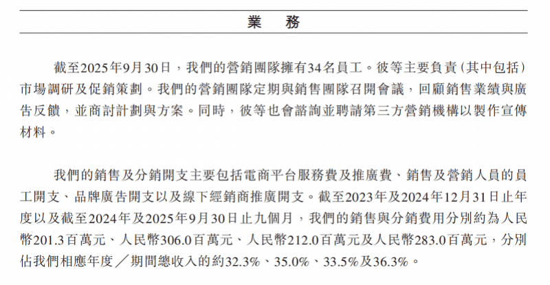 根据招股书,爷爷的农场2024年、2025年前9个月的销售与分销费用分别约为人民币2.01亿元、3.06亿元、2.12亿元及2.83亿元;分别占相应年度总营收的32.3%、35.0%、33.5%及36.3%。也就意味着其一年的销售及分销费用加起来营收占比接近七成。