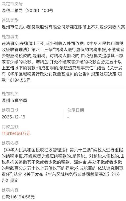 近日,多方信息显示,温州市亿兆小额贷款股份有限公司(以下简称“亿兆小贷”)因涉嫌在账簿上不列或少列收入,被罚款超11.6万元。