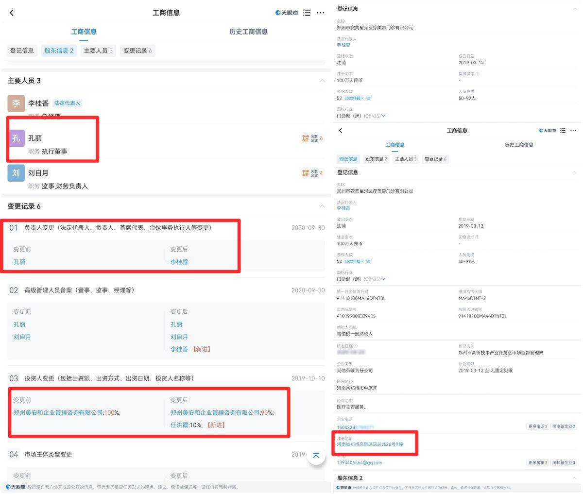 成立于2019年的郑州市安美星河医疗美容门诊有限公司,最早的法人同样是孔丽,其于2020年将法人变更为李桂香,孔丽担任执行董事职位。该机构于2023年注销。