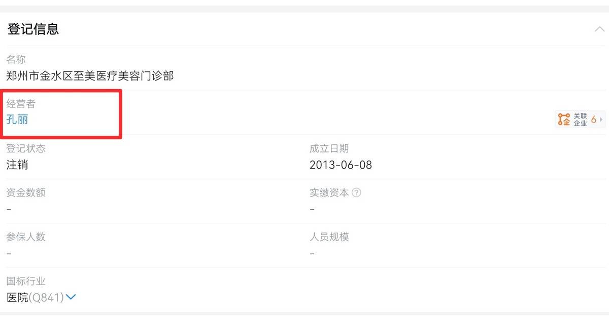 天眼查数据显示,成立于2013年的郑州市金水区至美医疗美容门诊部,经营者为孔丽,目前已注销。