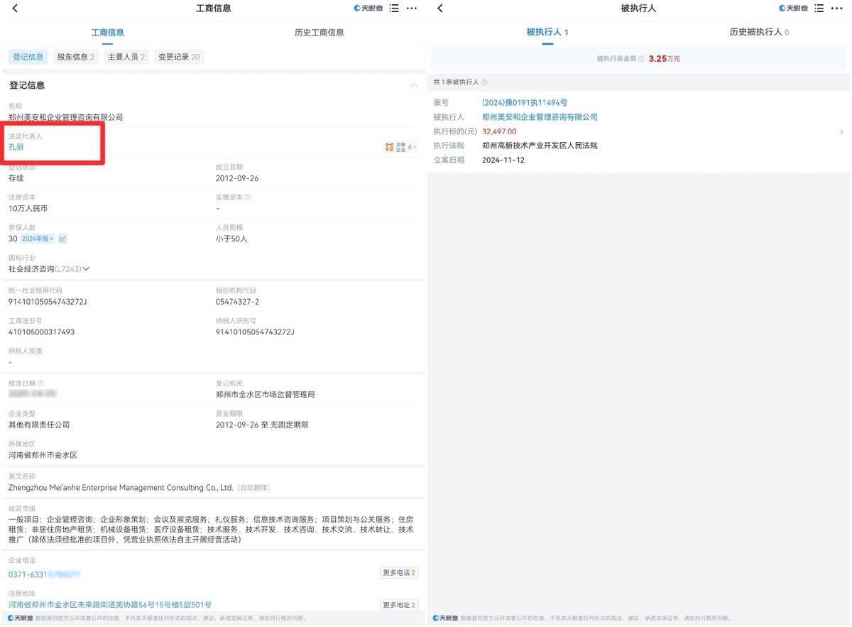 郑州美安和企业管理咨询有限公司,法人代表孔丽。该公司曾于2024年11月2日被郑州高新技术产业开发区人民法院列为被执行人,执行金额3.25万元。