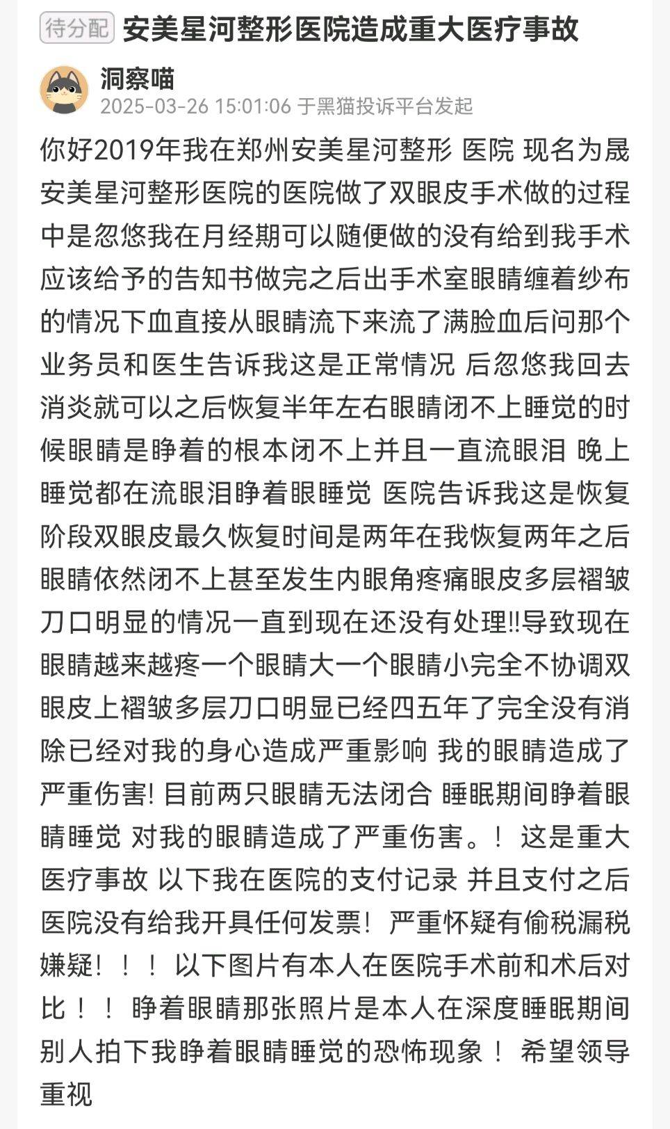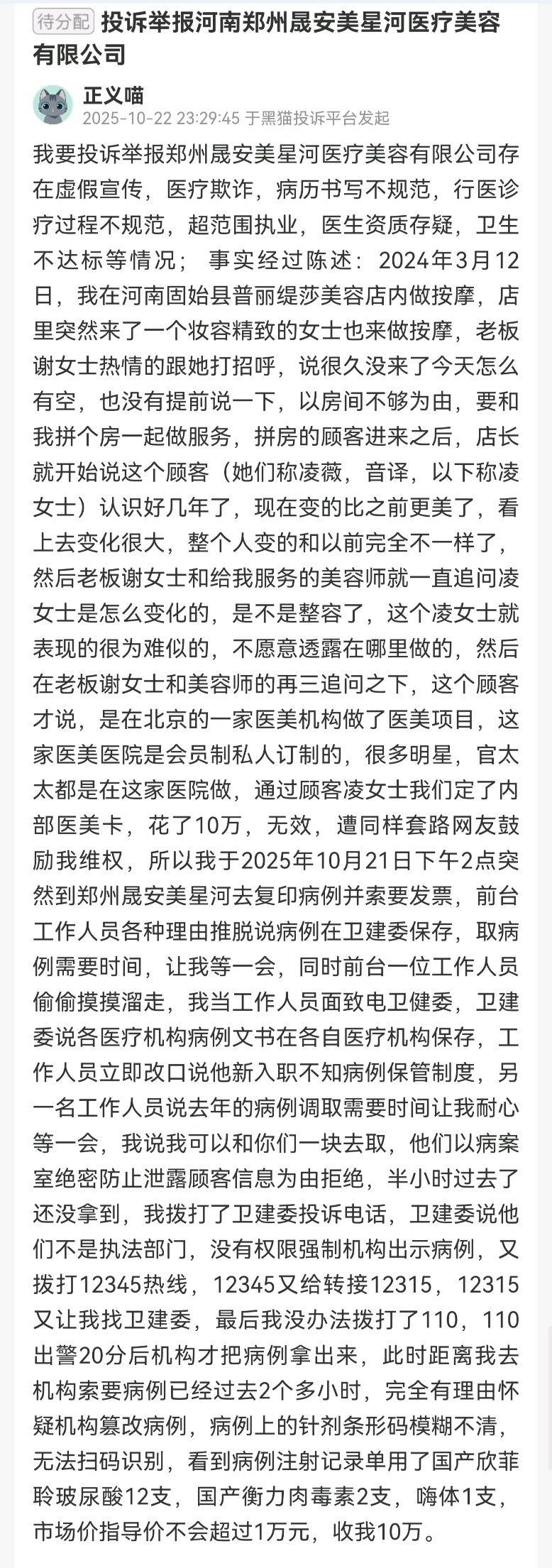 该消费者于2025年10月22日,在黑猫投诉平台发长文举报河南郑州晟安美星河医疗美容有限公司,指出该机构存在虚假宣传、医疗欺诈、病历书写不规范、行医诊疗过程不规范、超范围执业、医生资质存疑、卫生不达标等情况。