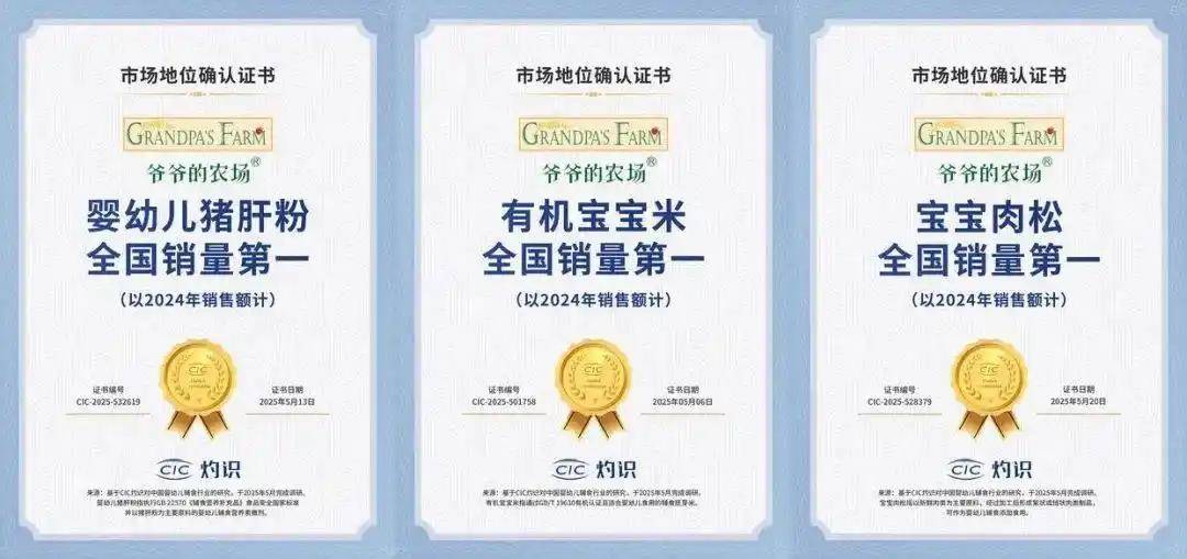 近日,“爷爷的农场”发文称,作为辅食喂养赛道的中坚力量,“爷爷的农场”凭借着在食品领域的精耕,在5月再次收获CIC灼识咨询颁发的三大权威市场地位确认证书,分别是:“婴幼儿猪肝粉全国销量第一(以2024年销售额计)”“有机宝宝米全国销量第一(以2024年销售额计)”“宝宝肉松全国销量第一(以2024年销售额计)”,品牌影响力得到进一步提升。