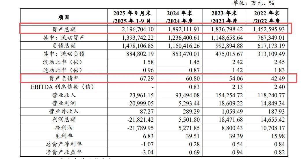 资产负债率的变化更能反映其债务压力的加剧:2022年至2025年9月末,公司资产负债率分别为42.49%、54.06%、60.8%、67.29%,三年时间债务杠杆率累计飙升近25个百分点。