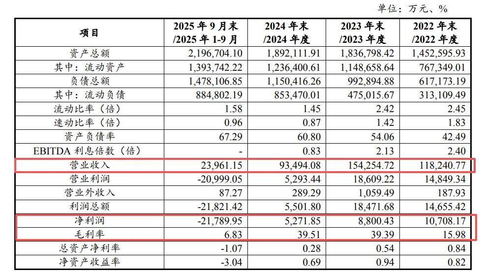 盈利能力的恶化体现在多个维度:2022年至2024年,公司毛利率分别为15.98%、39.39%、39.51%,但到2025年9月末公司毛利率骤降为6.83%,毛利润仅0.16亿元,同比锐减93.81%。
