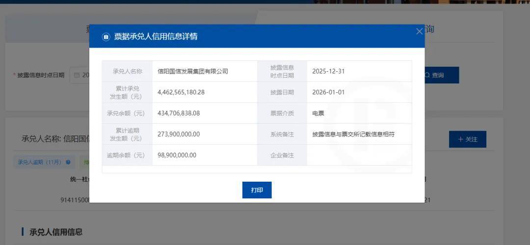 据上海票据交易所显示,截至2025年12月31日,信阳国信累计承兑发生额达44.62亿元,当前承兑余额4.35亿元,而累计逾期发生额2.74亿元,当期逾期余额9890万元。