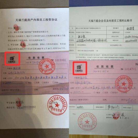 据张某泉、陶某潞提供的材料证实,他们向烟台天福兰庭缴纳“投资款”时,对方出具的竟是“天福集团付款审批单”,单据与收款收据上均印有“天福集团”企业形象LOGO。