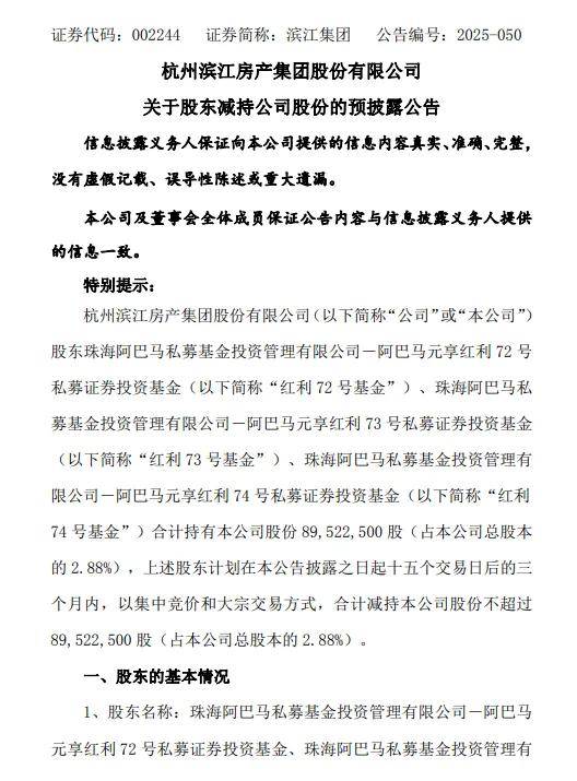 据滨江集团公告,2025年11月15日,公司披露控股股东一致行动人元享红利72号、73号、74号私募基金的减持计划,拟三个月内减持不超过8952.25万股,占总股本2.88%。截至2025年12月23日,上述基金已通过集中竞价和大宗交易累计减持2889.27万股,占总股本0.928%,按期间平均股价测算,套现金额超4亿元。