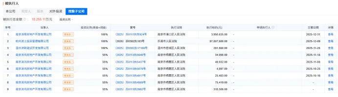 其中,控股子公司杭州滨上投资管理有限公司于2026年初被乐清市法院列为被执行人,单案执行金额高达9780万元,占总执行金额的61%;全资子公司南京滨晖房地产开发有限公司、温州滨致建设开发有限公司,以及控股子公司南京滨鸿房地产开发有限公司,均在2025年出现多条被执行记录,涉及合同纠纷、工程款支付等多项案由。