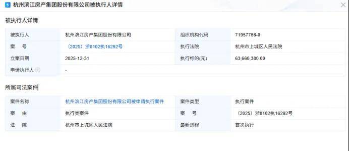 2025年12月31日,本是辞旧迎新的节点,深耕杭州的民营房企滨江集团(002244.SZ)却意外迎来司法层面的“冲击”。据天眼查、企业预警通等平台信息,这家素有“民营房企之光”称号、以产品品质和财务稳健著称的上市企业,当日新增被执行人信息,执行金额超6366万元。