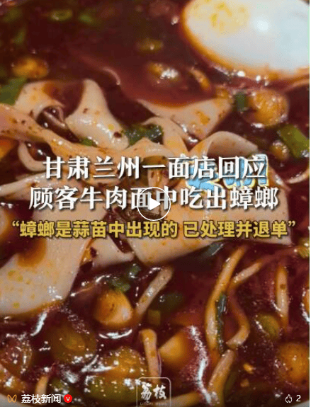 近日,甘肃兰州,顾客在一家清真牛肉面店吃面,面中发现一只蟑螂。对此,该店工作人员回复称,蟑螂是在抓蒜苗放入面中时出现的,不是面条里的。已经把一筐蒜苗都倒掉了,已为顾客做了退单处理。