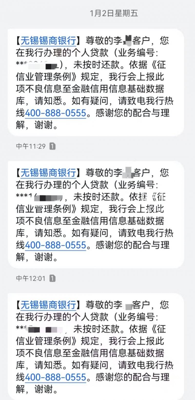 1月4日,信号新闻报道了无锡锡商银行股份有限公司(以下简称“锡商银行”)违规异地放网贷一事(详见《无锡锡商银行违规异地放网贷 董事长行长均被约谈 法院判借款合同有效》)。李先生在法院判决下达后,结清了剩余本金、利息、罚息等费用。令他感到意外的是,2026年1月2日,锡商银行仍以“未按时还款”为由向其发送催收短信,称将“上报此项不良信息至金融信用信息基础数据库”。对此,锡商银行对他解释说,系“对公转账对账存在时差”所致。