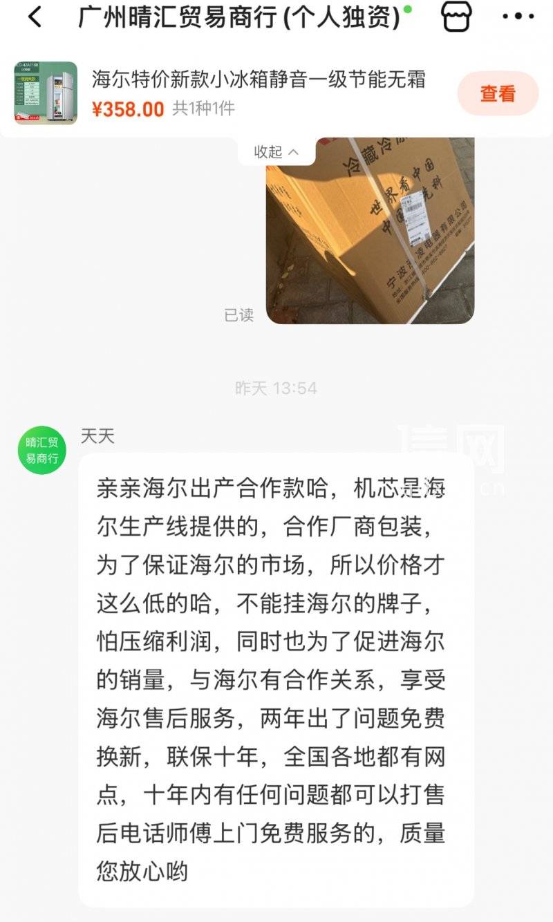 1月4日,李女士在阿里巴巴1688平台“广州晴汇贸易商行”店铺下单了一款标注为“海尓”牌的节能小冰箱,花费358元。1月6日收到货,李女士发现,该冰箱是宁波泓凌电器有限公司生产的“先科”牌。她随即联系店铺客服,对方答复称,这款冰箱是海尔出产的合作款,机芯是海尔生产线提供的,合作厂商组装,只是因为价格低,不能挂海尔的牌子。因为与海尔有合作关系,该产品可以享受海尔售后服务,包括两年换新、联保十年等,而且全国各地都有服务网点。