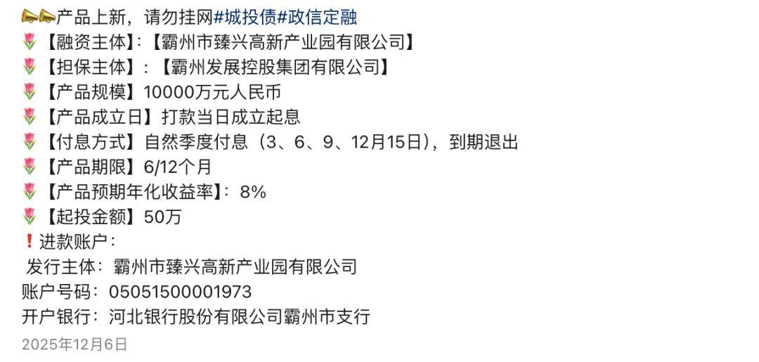 据另一张图片显示,霸州发展为霸州臻兴提供担保,该融资产品规模达1亿元,期限为6个月、12个月,产品预期年化收益率为8%,起投金额为50万元。