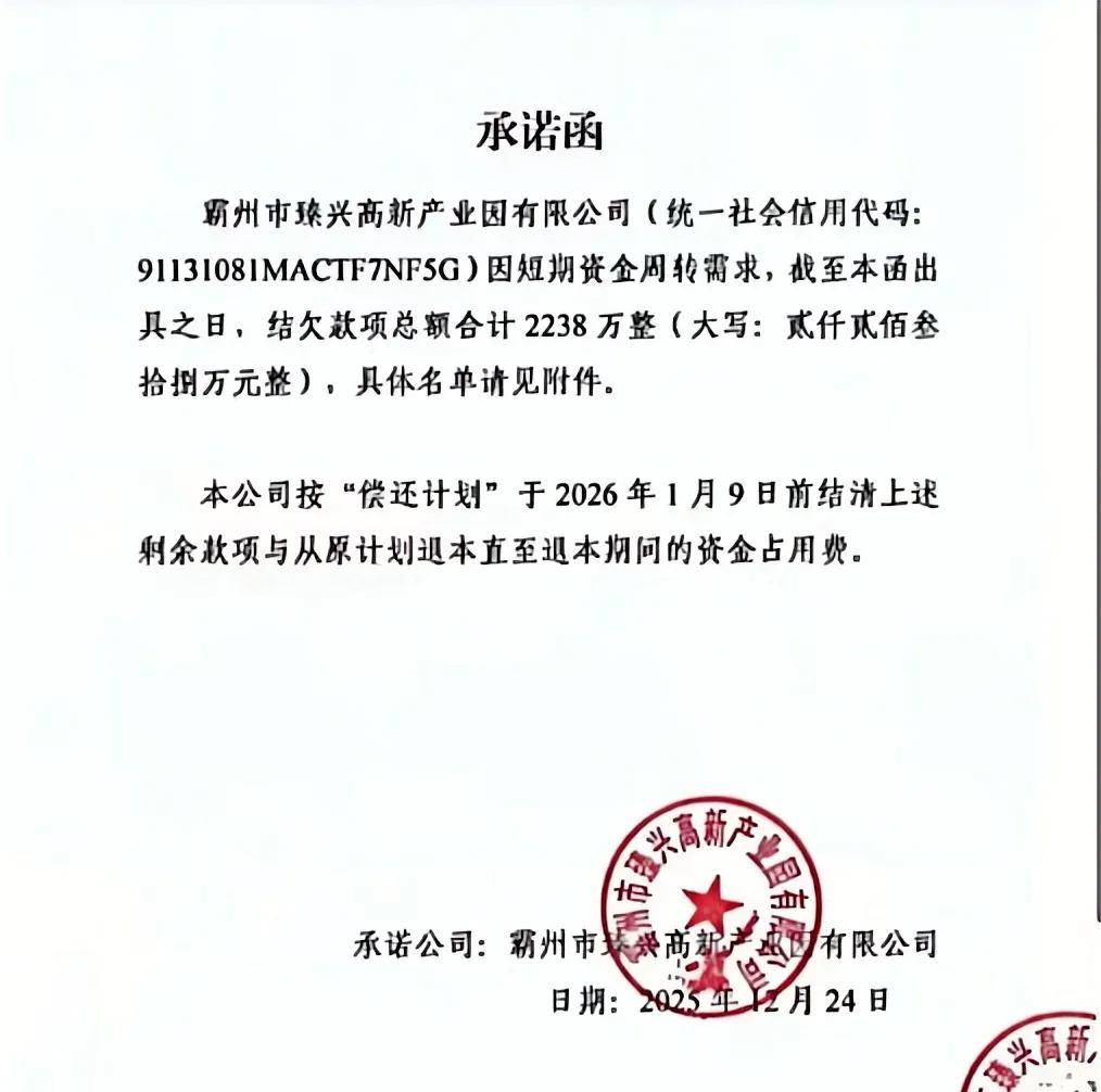 近期,霸州发展控股集团有限公司(以下简称“霸州发展”或“公司”)被曝出子公司短拆违约。据投资人之间流传出的图片信息,霸州市臻兴高新产业园有限公司(以下简称“霸州臻兴”)于2025年12月24日出具承诺函称,霸州臻兴因短期资金周转需求,结欠款项总额合计2238万整,上述款项将于1月9日结清。因霸州臻兴展期后再次逾期,引发投资人密切关注。