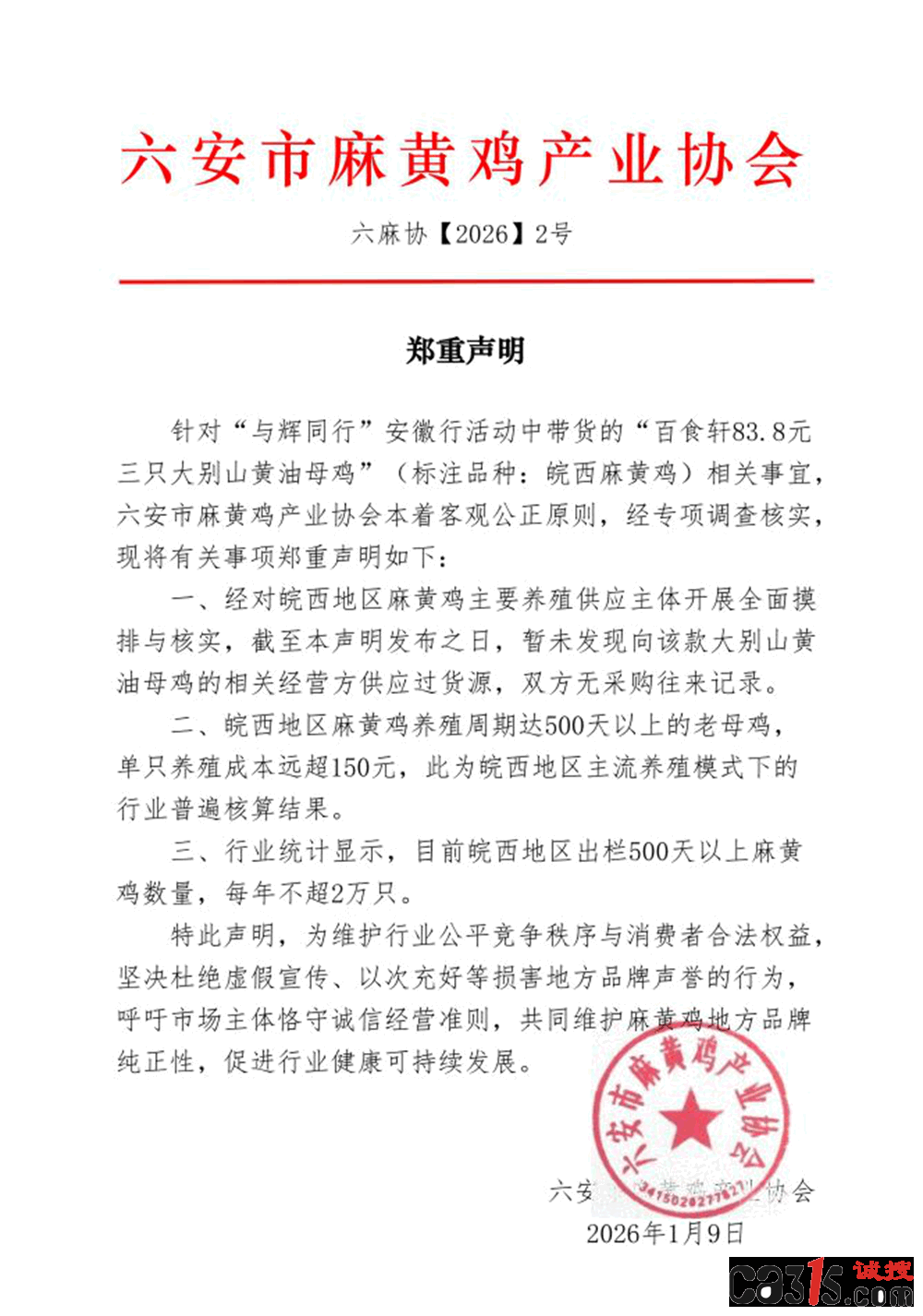 近日,知名直播间“与辉同行”在安徽专场中销售的“大别山黄油母鸡”引发行业质疑。据中国食品安全网报道,六安市麻黄鸡产业协会发布郑重声明,指出该产品存在虚构品种、外观不符、货源不明等多重问题,与其宣传的“严苛选品”形成鲜明反差。