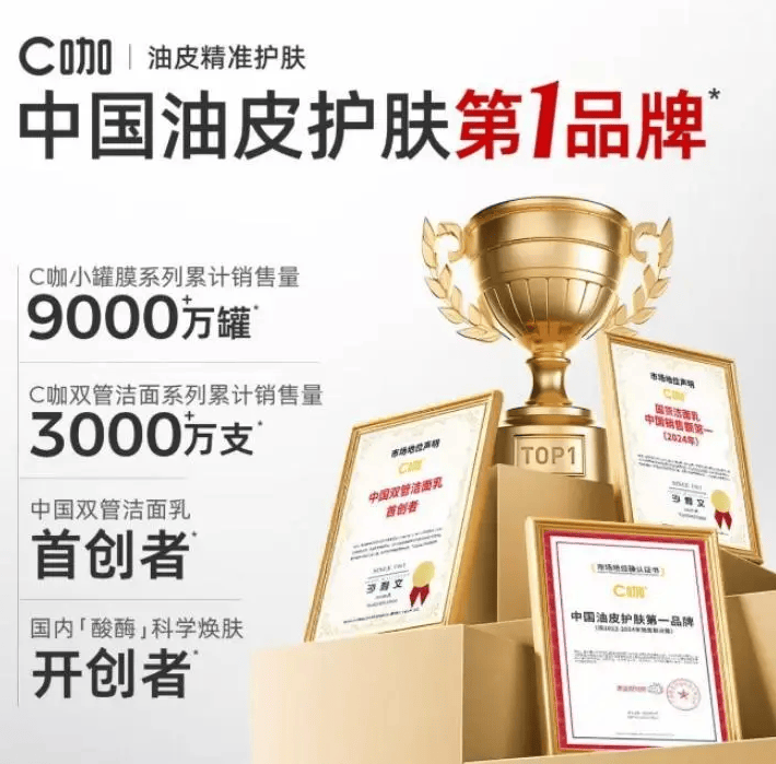 自2023年12月签约王一博以来,C咖的崛起始终与“流量营销”深度绑定。顶流代言带来的海量曝光,让其迅速登顶面膜和洁面品类榜首,线下入驻超40000家门店,形成了“流量-销量-规模”的增长闭环。但这种增长模式也让C咖陷入了营销路径依赖——脱离了夸张话术和权威背书,品牌似乎难以维持高增长态势。