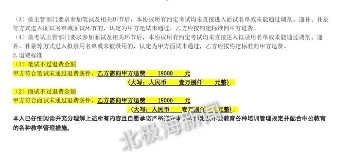 朱某向北极海新闻反映,2022年,他为备战公务员考试,在山东省菏泽市中公教育曹县分公司花费19900元报名了“7天7晚考公特训营”。合同上明确写着“考不过退费18000元”,合同乙方为北京中公教育科技有限公司(以下简称:北京中公)。这本是他备考路上的一颗定心丸,却没想到成了日后三年挥之不去的维权噩梦。