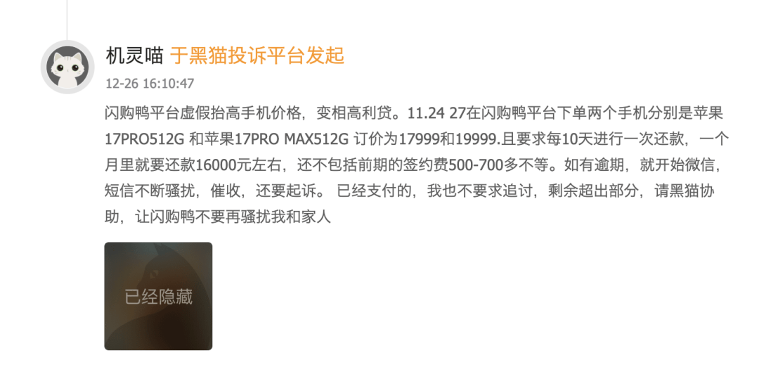 闪购鸭则是一个新平台,投诉量近200个。用户表示在平台下单两个手机,分别是苹果17PRO512G 和苹果17PRO MAX512G定价为17999和19999,且要求每10天进行一次还款,一个月里就要还款16000元左右,还不包括前期的签约费500-700多不等。