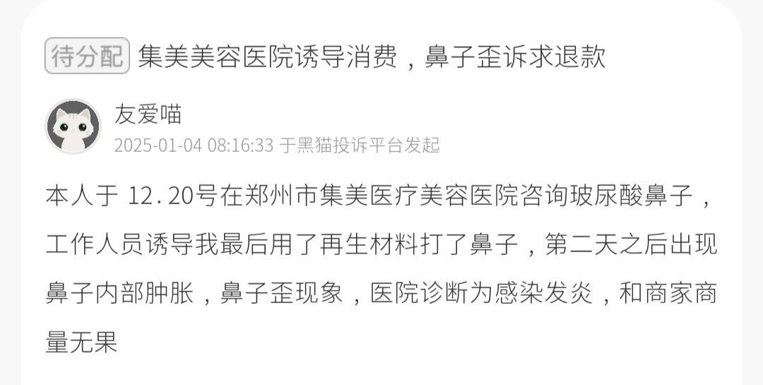 1月4日,有消费者在黑猫投诉平台对郑州集美医疗美容发起投诉,称其本人于2024年12月20日在郑州市集美医疗美容医院咨询玻尿酸鼻子项目,期间工作人员诱导其最终改用再生材料进行鼻部注射,术后次日即出现鼻子内部肿胀及鼻子歪斜现象,医院方面诊断为感染发炎,该消费者与商家多次协商无果,遂提出退款诉求。截至深度美业发稿前,该投诉尚处于待分配状态。