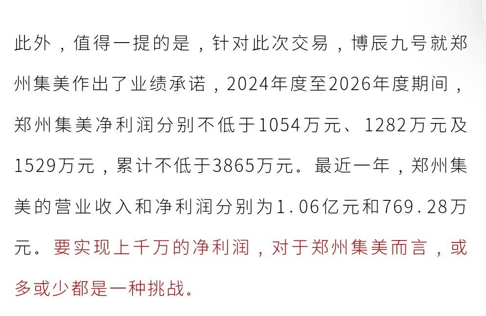 2024年5月,医并购指出,针对此次并购交易,博辰九号就郑州集美作出了业绩承诺,2024年度至2026年度期间,郑州集美净利润分别不低于1054万元、1282万元及 1529万元,累计不低于3865万元。
