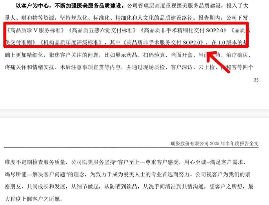 报告期内,朗姿股份下发《高品质珍 V 服务标准》《高品质五感六觉交付标准》《高品质非手术精细化交付 SOP2.0》《品质医美交付准则》《机构品质年度评级标准》,其中《高品质非手术服务交付 SOP2.0》,在 1.0 版本的基础上更加精细化,聚焦客户关注的问题,比如展示药品、扫码验真、当面开盒、当面配药、治疗确认、疼痛关怀和情绪安抚、术后注意事项宣贯等内容,并通过现场质检、客户深访、云上检、神秘客等四个维度不定期检查服务质量。
