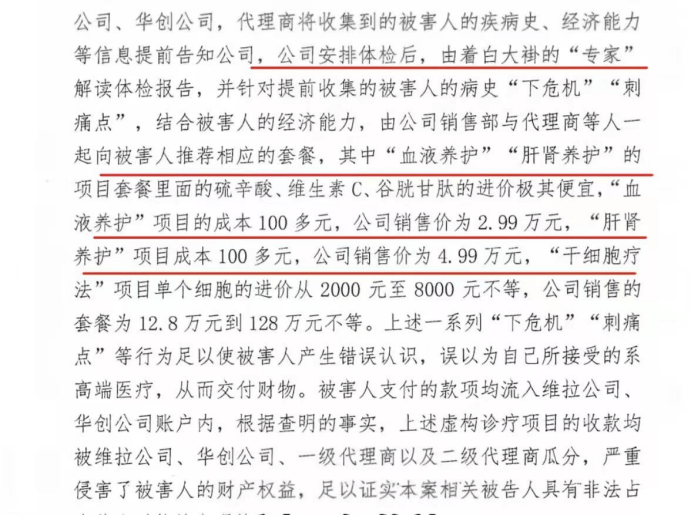 2022年,徐女士被警方告知,其接受服务的江西机构涉嫌医疗诈骗,且该诈骗团伙成员已于2024年被判刑。判决书显示,该团伙以旅游体检为名,诱骗三千余人,涉案金额高达5.3亿元。其中,成本仅百元的维生素C注射液被包装成“干细胞疗法”,售价却高达数万元。例如,“血液养护”项目成本100多元,售价2.99万元;“干细胞疗法”项目单个细胞进价2000元至8000元,售价12.8万元至128万元不等。