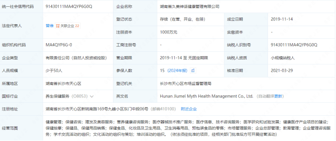 企查查公示系统显示,湖南久美神话健康管理有限公司拥有“久美神话”医药、医疗园艺商标版权,该公司成立于2019年11月14日,法定代表人曾维,刘小玲担任监事职务。