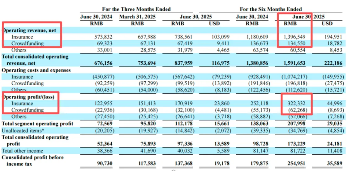值得注意的是,水滴筹业务本身并不赚钱。最新财报数据显示,2025年上半年,水滴筹业务的收入为1.35亿元,同比减少1.55%;营业亏损也从去年同期的0.55亿元扩大至0.62亿元。