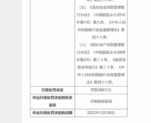 据国家金融监督管理总局官网2023年1月4日发布的豫银保监罚决字[2022]128号行政处罚决定书显示,早在2022年12月30日,原河南银保监局就已针对国开行河南分行的多项严重违规行为作出处罚:包括违规转嫁抵押登记费和押品评估费、向不合规项目发放贷款、流动资金贷款受托支付审查不尽职且重复融资、固定资产贷款受托支付未收集用途资料导致信贷资金被挪用归还本行前期贷款本金、银团贷款贷后管理不尽职等违规行为,依据《中国银监会关于整治银行业金融机构规范经营通知》(银监发[2012]3号)、《中华人民共和国银行业监督管理法》、《流动资金贷款管理暂行办法》等多项法律法规,对国开行河南分行处以260万元罚款。