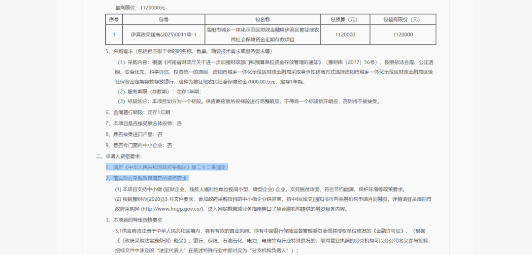 该项目采购人为洛阳市城乡一体化示范区财政金融局,项目采购需求为选择区级社保资金定期存款存放银行,涉及被征地农民社会保障资金7000万元,存款期限1年。