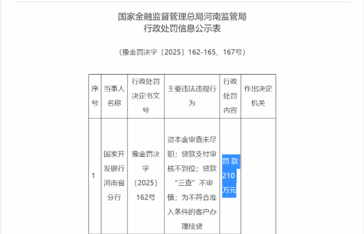 最新处罚信息显示,国开行河南分行因资本金审查未尽职、贷款支付审核不到位、贷款“三查”不审慎,以及为不符合准入条件的客户办理续贷等违规行为。国家金融监督管理总局河南监管局(下称“河南监管局”)对其作出罚款210万元的行政处罚,决定书文号为豫金罚决字[2025]162号。