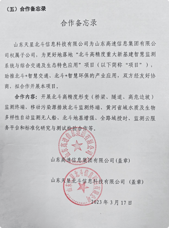 此外,于2023年3月17日,山高信息集团与天星北斗公司签订了合作备忘录,拟合作开展山高北斗产业重大工程项目。